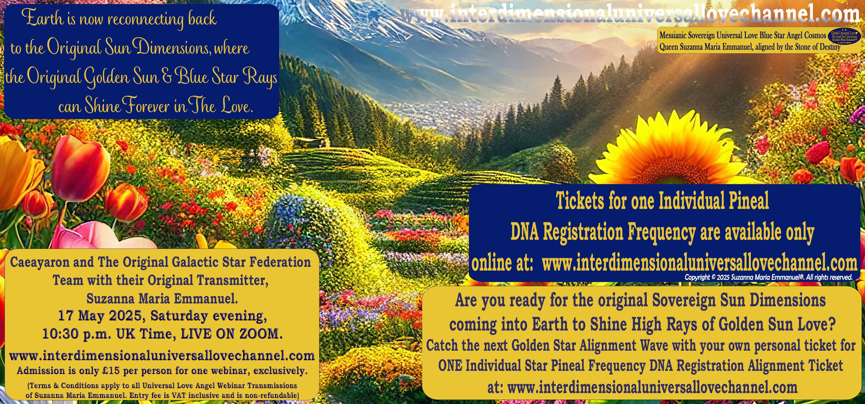 These transmissions are all guided by Sovereign Universal Love and are all transmitted by Suzanna Maria Emmanuel's Original Sovereign Universal Love Pineal Angel Channel. All who regularly participate in the Universal Love Transmissions and Meditations on this Universal Love Blue Star & Golden Sun Consciousness Platform, can reconnect into many layers of their Original Cosmos Star DNA Codes of Life that come in, by viewing the Universal Love Galactic Star Transmissions and Meditations posted on this platform.