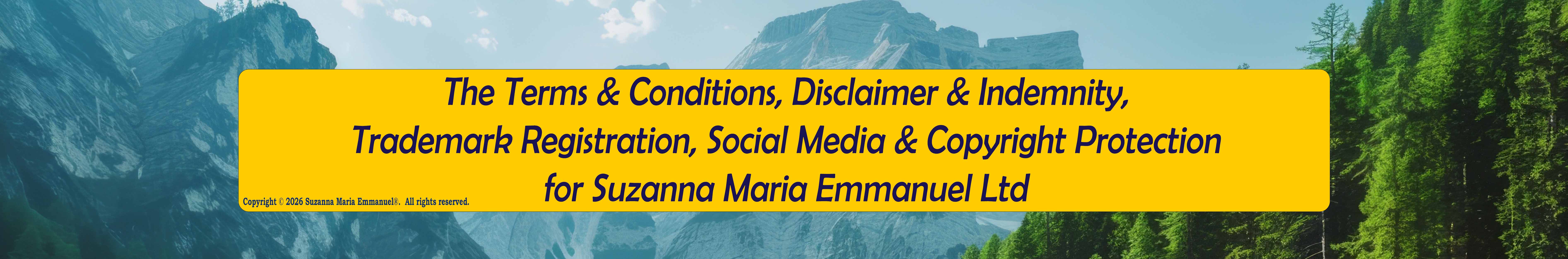 Suzanna Maria Emmanuel Ltd can update all Legal Disclaimer & Indemnity, Trademark & Copyright Protection and Terms & Conditions Information at any given time to protect her work, the codes, and all her transmissions. Copyright © 2026 Suzanna Maria Emmanuel®. All rights reserved.