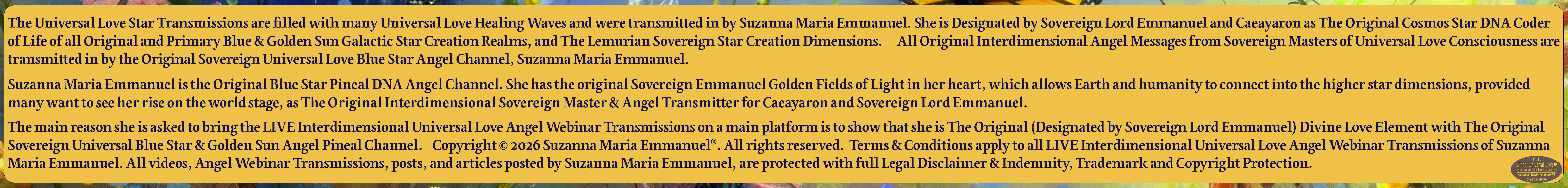 · The transmissions or material on the Universal Love membership meditation site are not to be promoted on any website in any way, shape, or form without the direction of Suzanna Maria Emmanuel® who is directed by Caeayaron. Suzanna Maria Emmanuel® maintains the full right to use the material for public shows, or workshops, or show her recorded information from her online platform site. No one else, other than the Sovereign Universal Love Channel, owner, and sole Director of Suzanna Maria Emmanuel® Ltd, has the right to share her information, given all is copyright information. Please know that the name Suzanna Maria Emmanuel® is trademarked to protect the reputation of Suzanna Maria Emmanuel®.